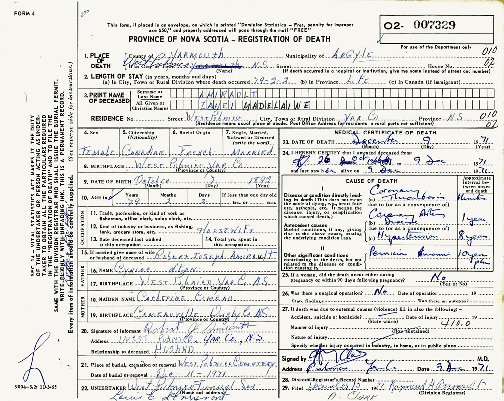 1. PLACE OF DEATH County of Yarmouth If in City or Town West Pubnico