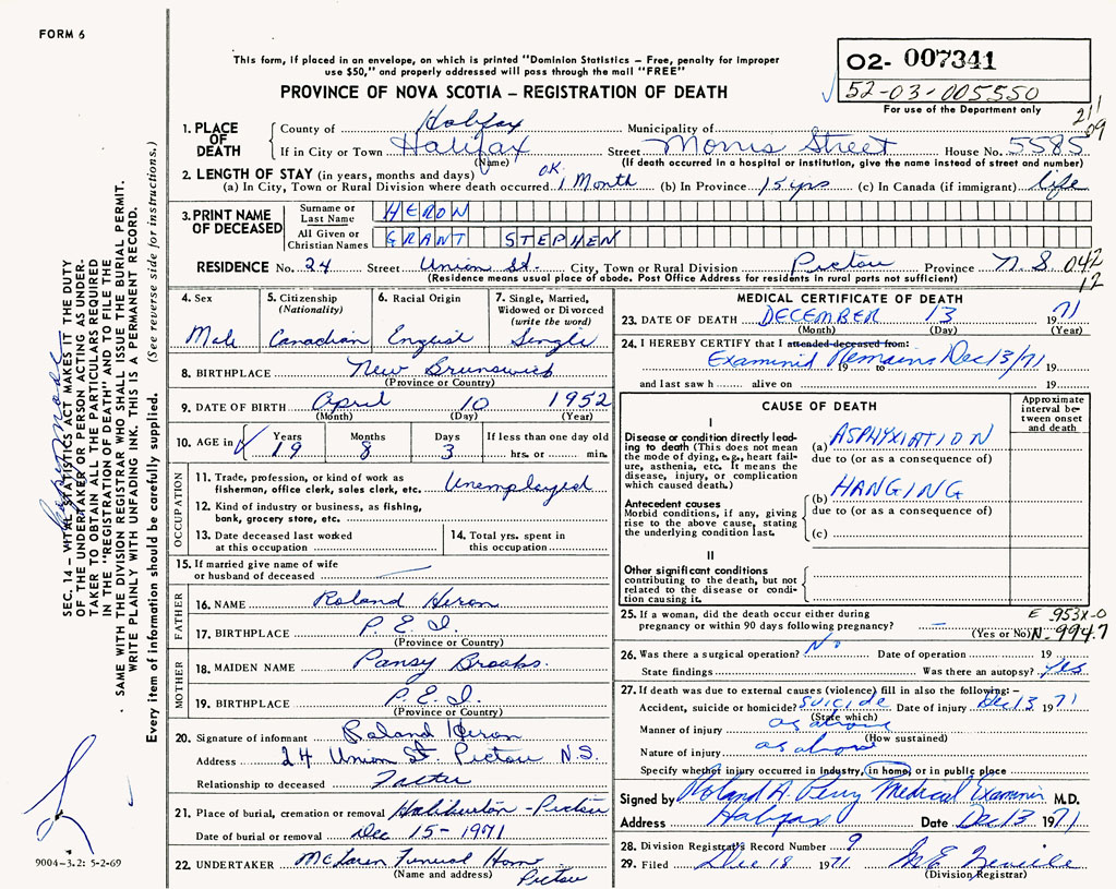 PROVINCE OF NOVA SCOTIA — REGISTRATION OF DEATH