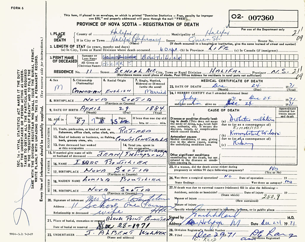 PROVINCE OF NOVA SCOTIA — REGISTRATION OF DEATH
