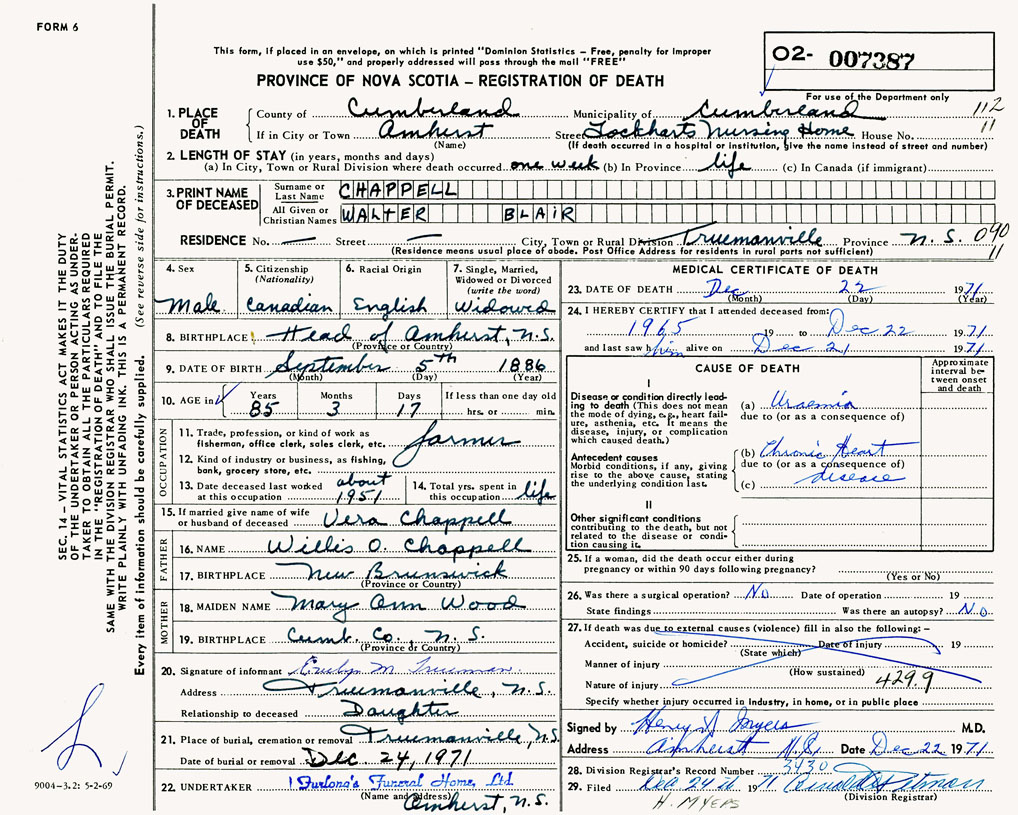 PROVINCE OF NOVA SCOTIA — REGISTRATION OF DEATH