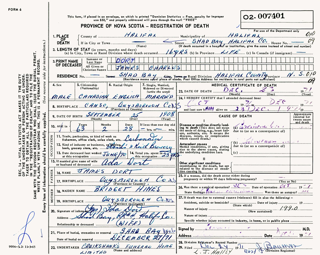 1. PLACE OF DEATH County of Halifax If in City or Town Shad Bay