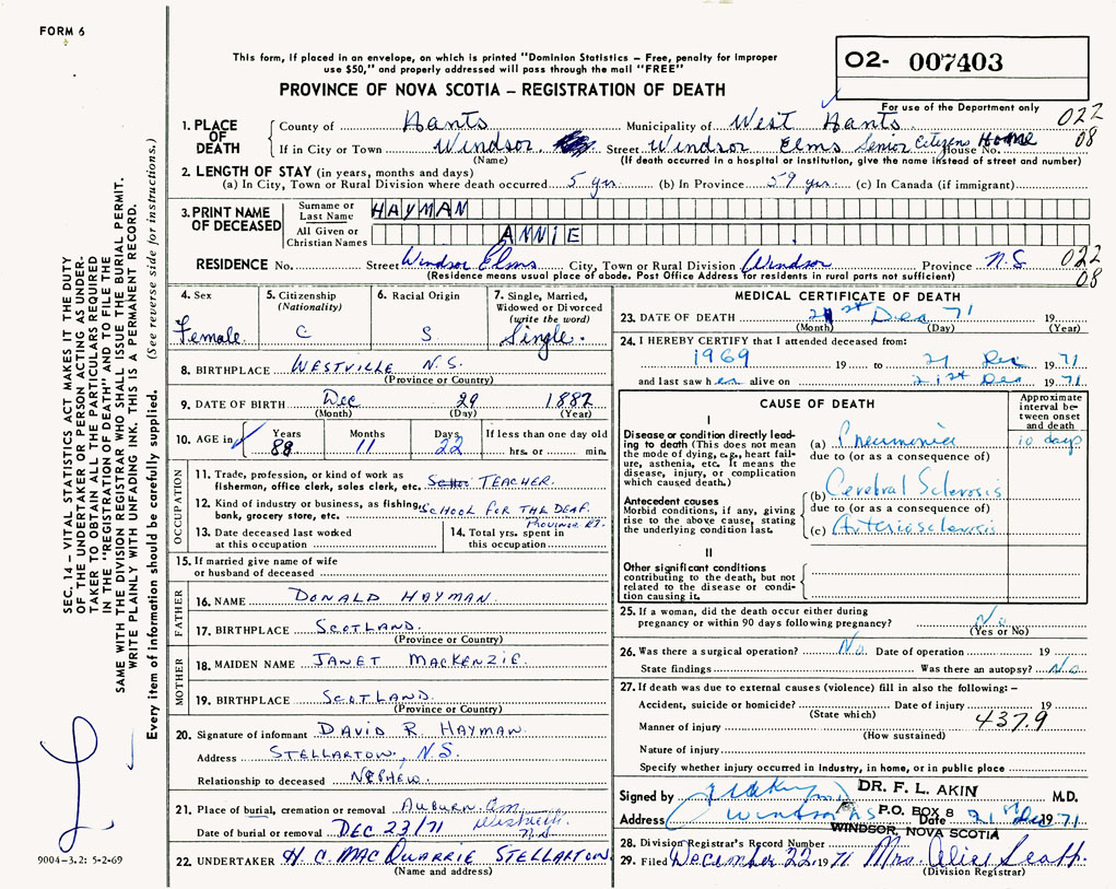 PROVINCE OF NOVA SCOTIA — REGISTRATION OF DEATH