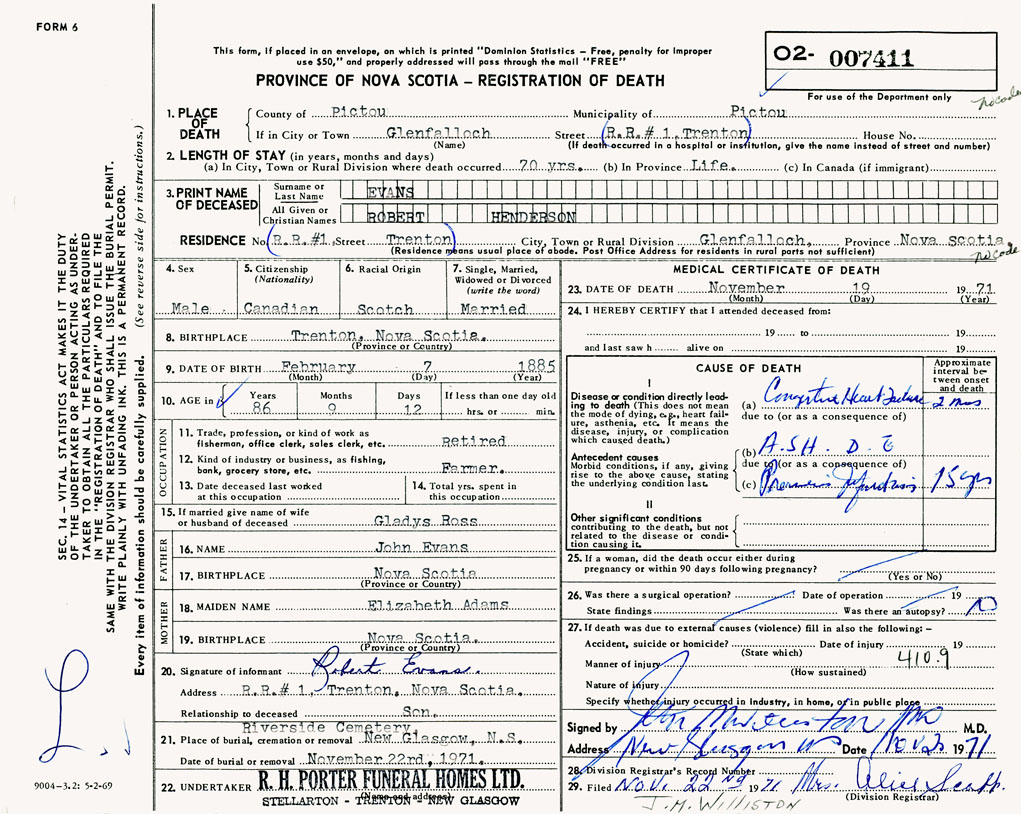 PROVINCE OF NOVA SCOTIA — REGISTRATION OF DEATH