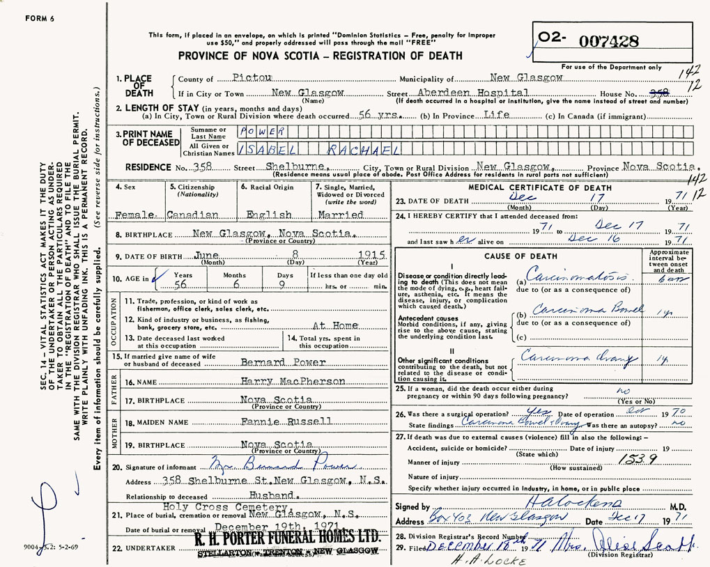PROVINCE OF NOVA SCOTIA — REGISTRATION OF DEATH