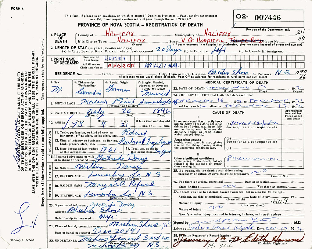 PROVINCE OF NOVA SCOTIA — REGISTRATION OF DEATH