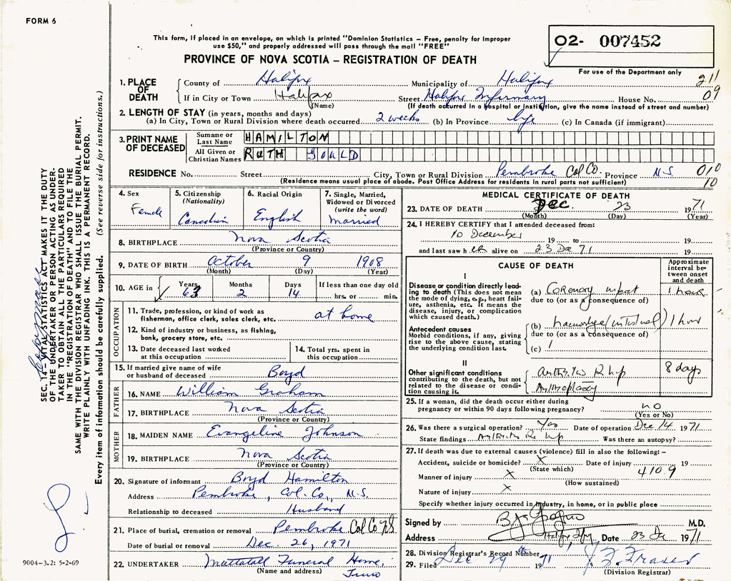 PROVINCE OF NOVA SCOTIA — REGISTRATION OF DEATH