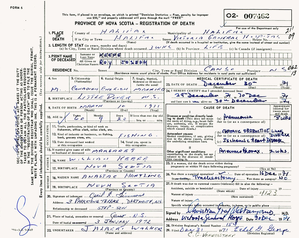 PROVINCE OF NOVA SCOTIA — REGISTRATION OF DEATH