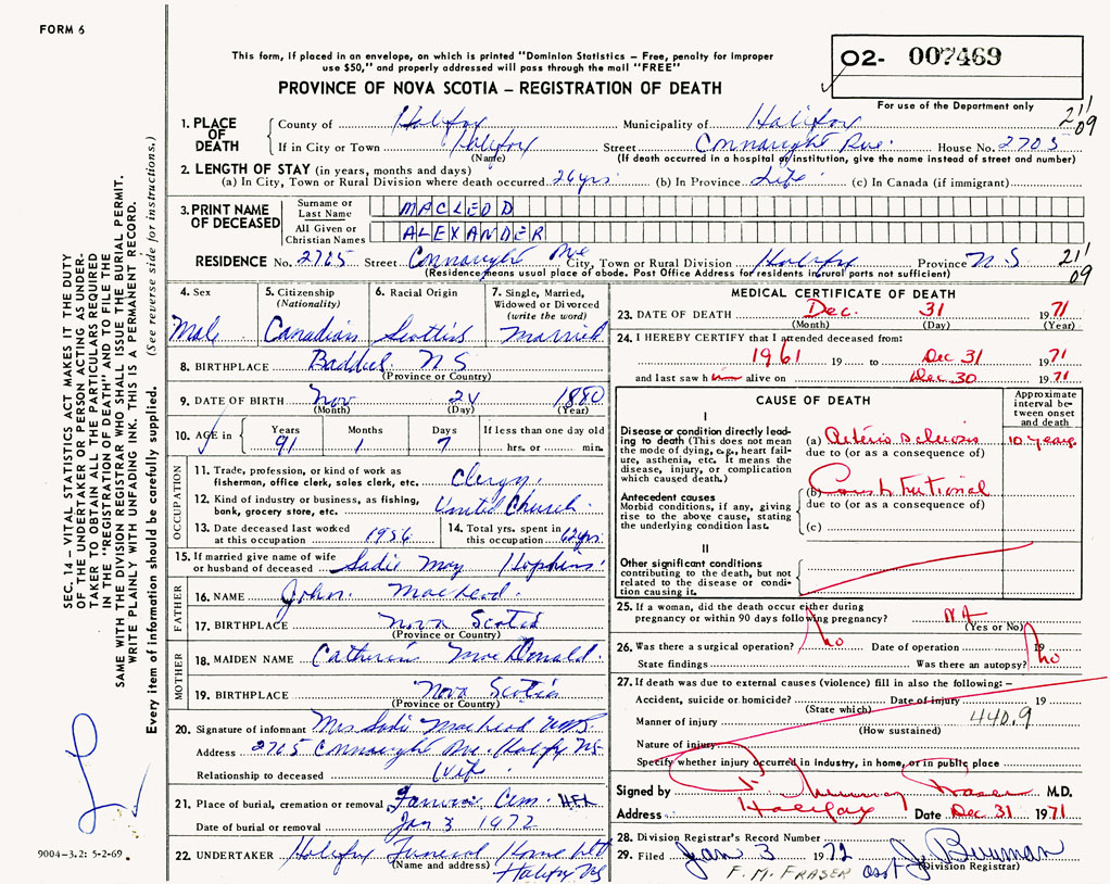 PROVINCE OF NOVA SCOTIA — REGISTRATION OF DEATH