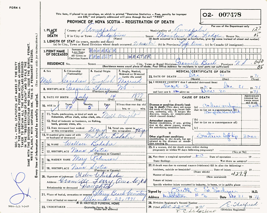 PROVINCE OF NOVA SCOTIA — REGISTRATION OF DEATH