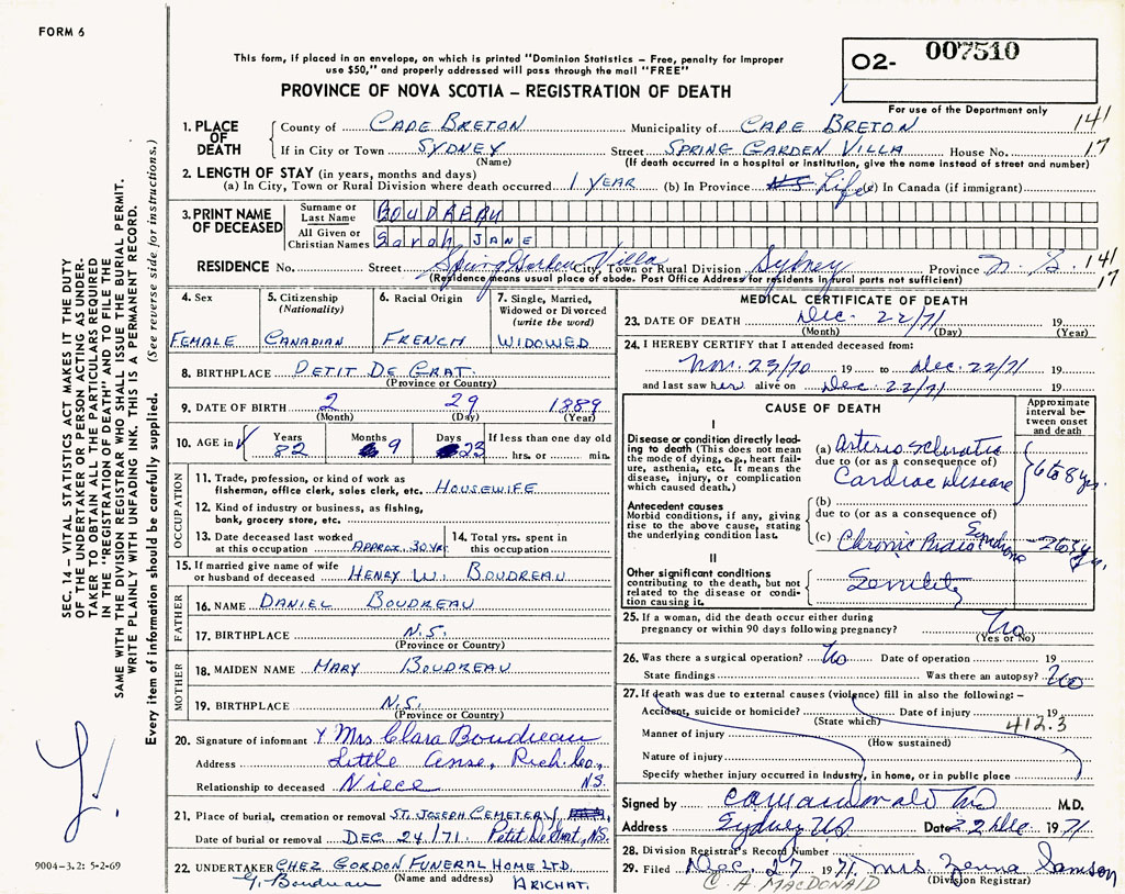 1. PLACE OF DEATH County of Cape Breton If in City or Town Sydney