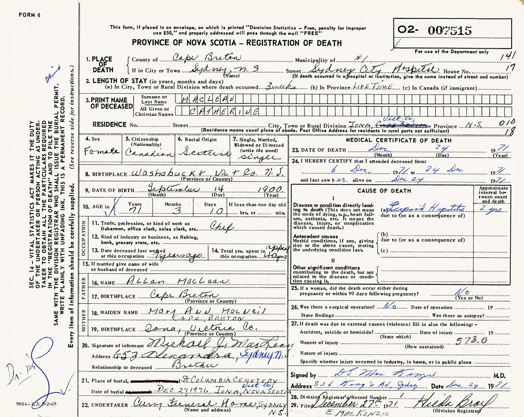 1. PLACE OF DEATH County of Cape Breton If in City or Town Sydney