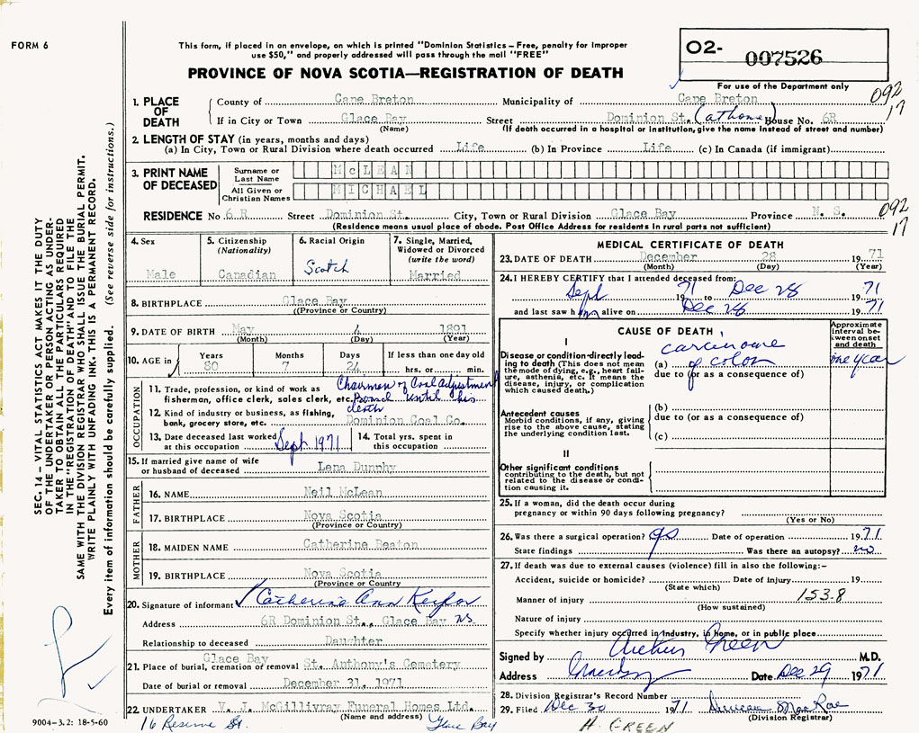 1. PLACE OF DEATH County of Cape Breton If in City or Town Glace Bay