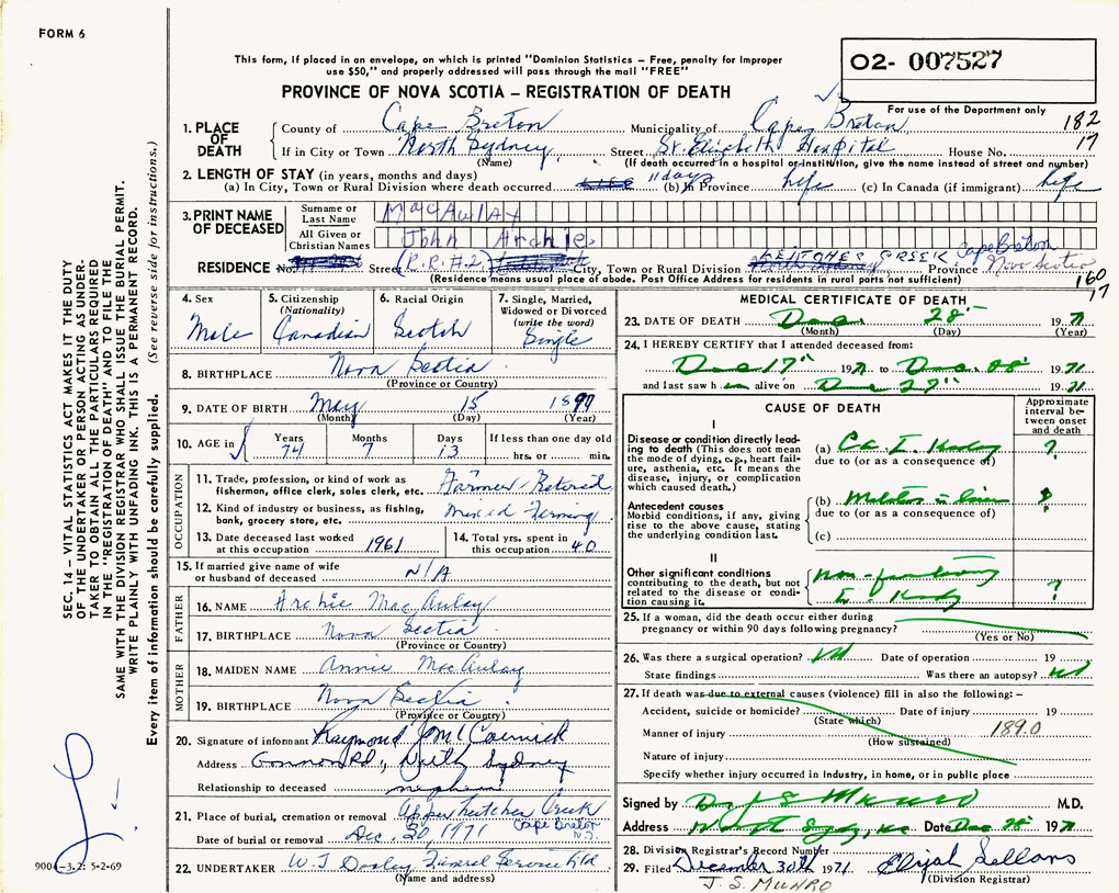 1. PLACE OF DEATH County of Cape Breton If in City or Town North Sydney