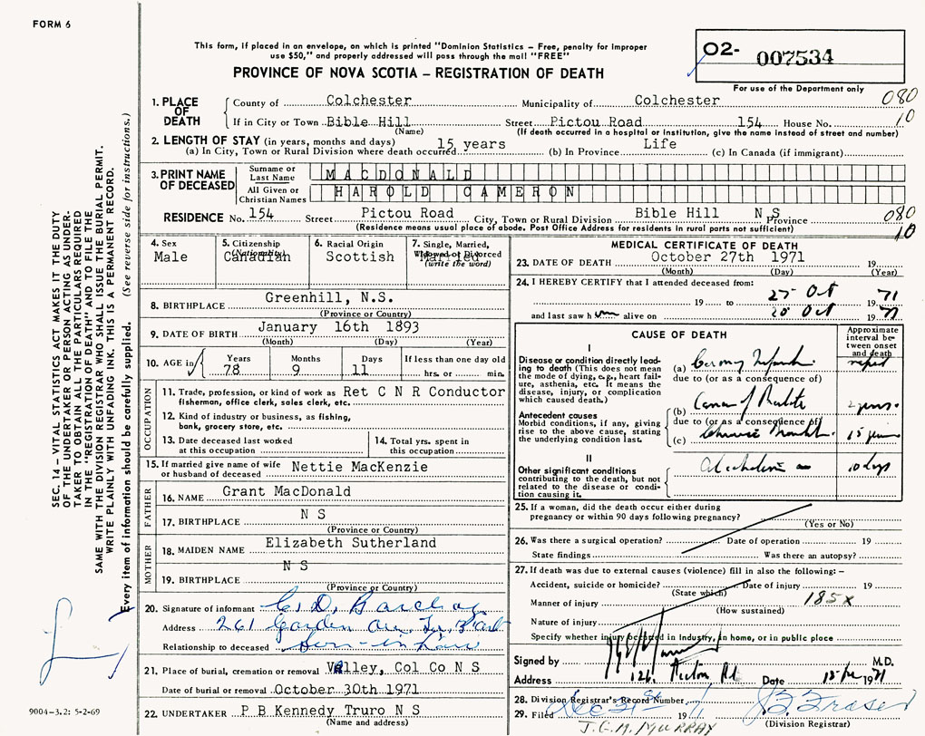 PROVINCE OF NOVA SCOTIA — REGISTRATION OF DEATH
