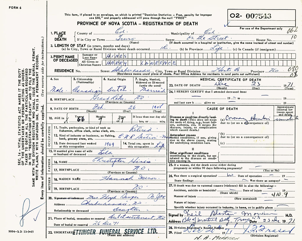 PROVINCE OF NOVA SCOTIA — REGISTRATION OF DEATH