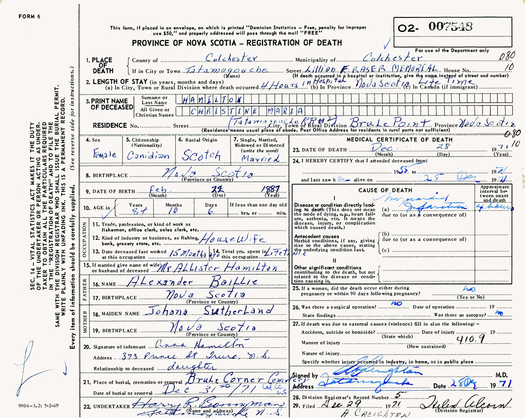 1. PLACE OF DEATH County of Colchester If in City or Town Tatamagouche