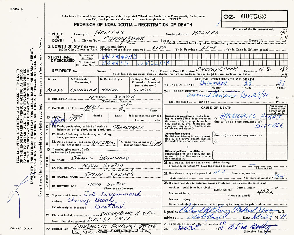 PROVINCE OF NOVA SCOTIA — REGISTRATION OF DEATH