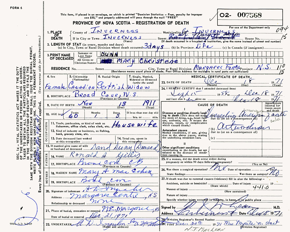 PROVINCE OF NOVA SCOTIA — REGISTRATION OF DEATH
