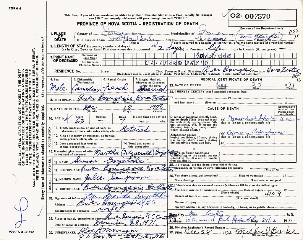 PROVINCE OF NOVA SCOTIA — REGISTRATION OF DEATH