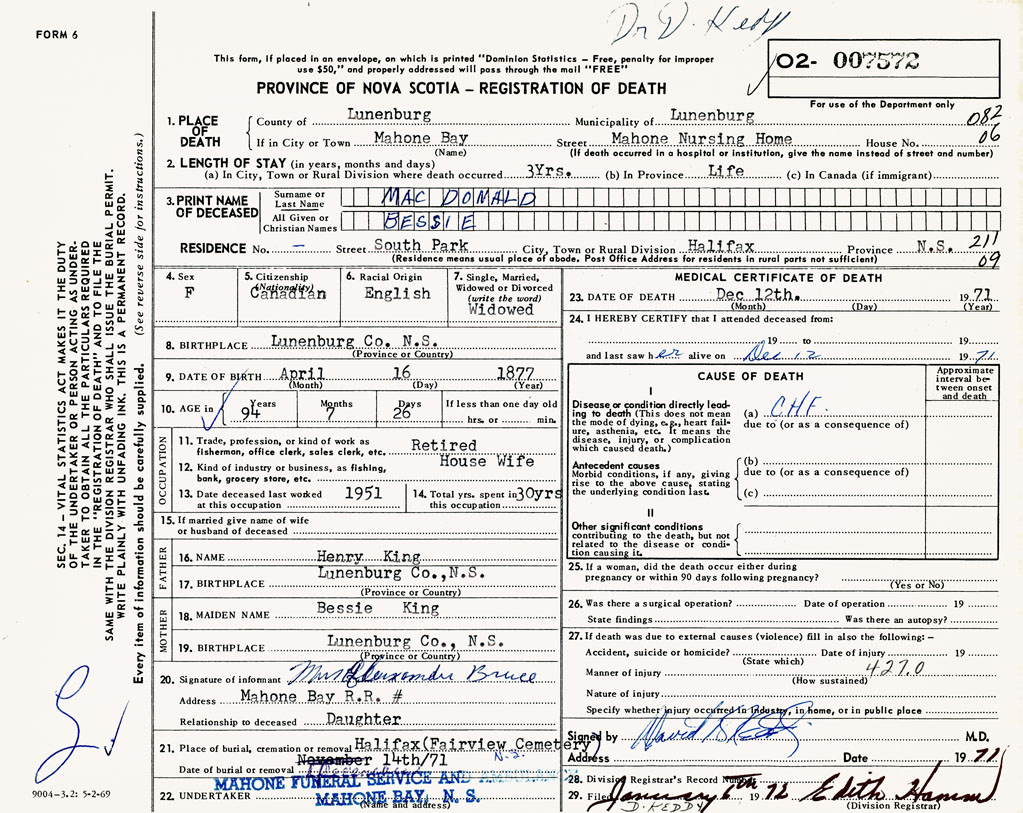 1. PLACE OF DEATH County of Lunenburg If in City or Town Mahone Bay