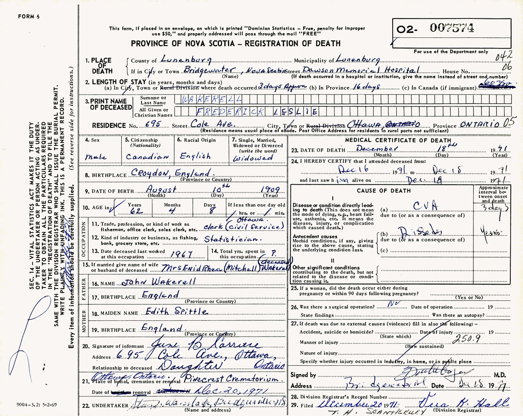 PROVINCE OF NOVA SCOTIA — REGISTRATION OF DEATH