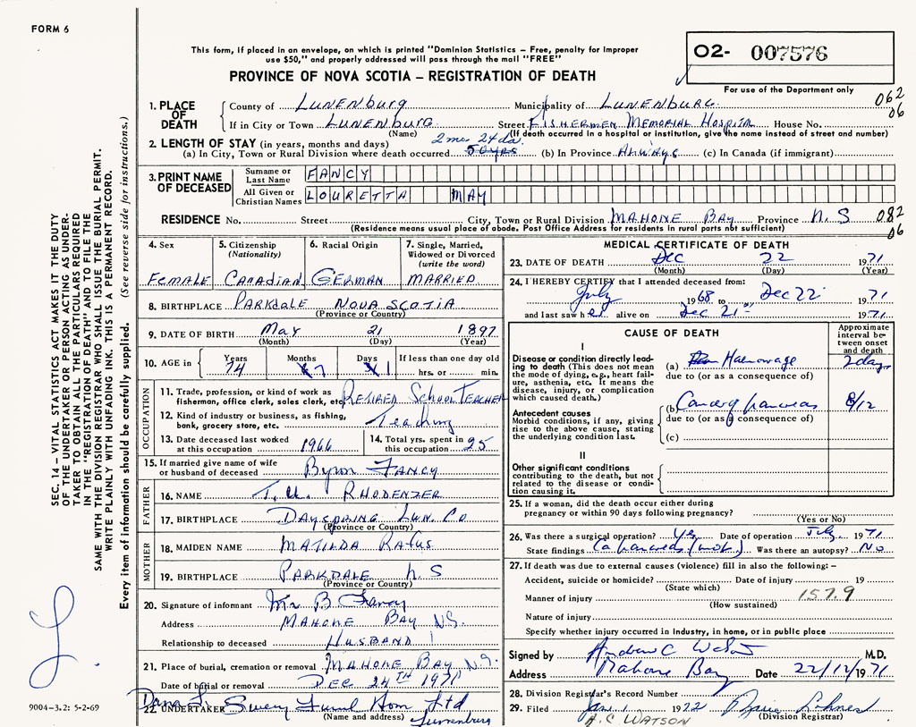 21. Place of burial Mahone Bay