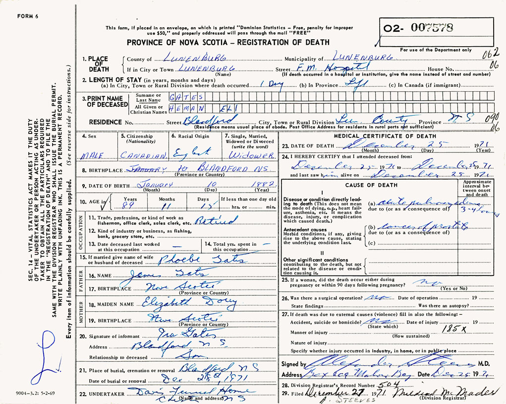 PROVINCE OF NOVA SCOTIA — REGISTRATION OF DEATH