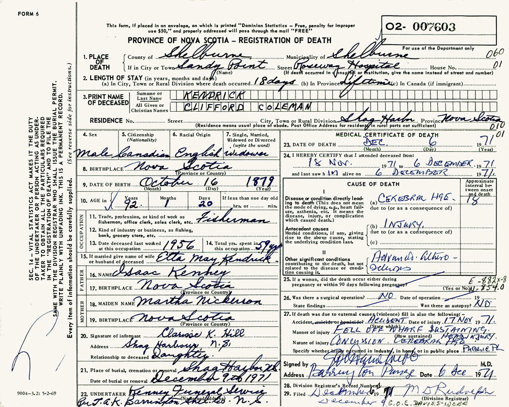 1. PLACE OF DEATH County of Shelburne If in City or Town Sandy Point