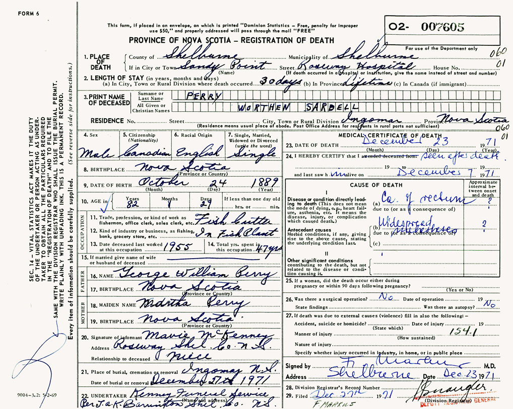 PROVINCE OF NOVA SCOTIA — REGISTRATION OF DEATH