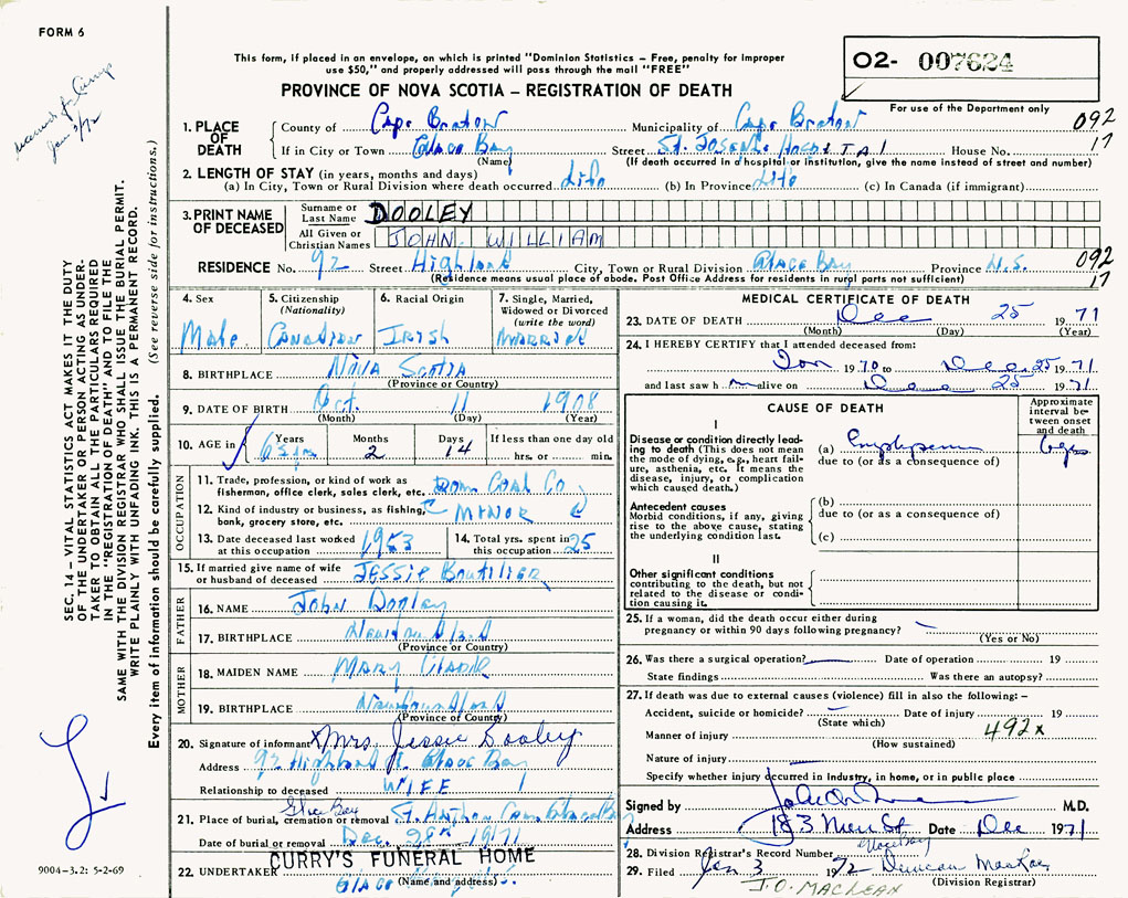 1. PLACE OF DEATH County of Cape Breton If in City or Town Glace Bay