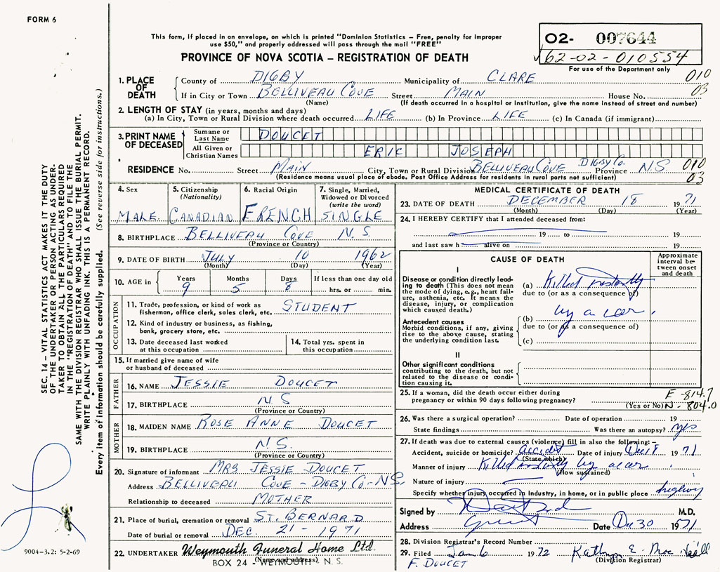 1. PLACE OF DEATH County of Digby If in City or Town Belliveaus Cove
