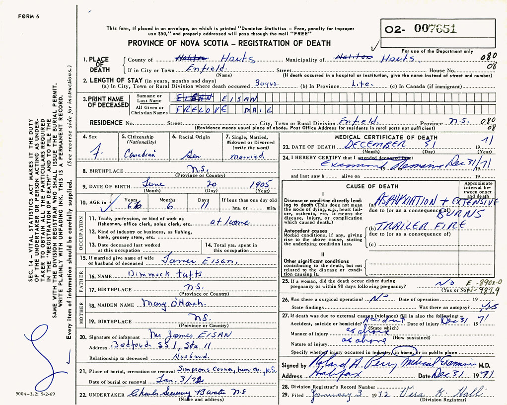PROVINCE OF NOVA SCOTIA — REGISTRATION OF DEATH