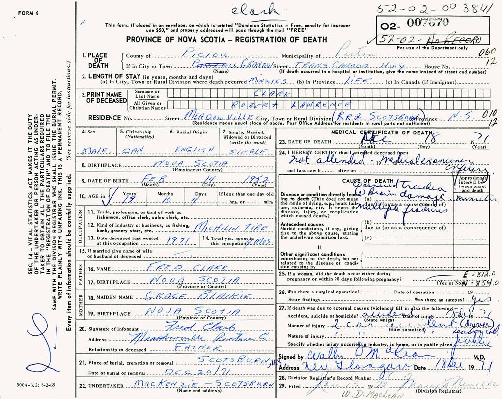 PROVINCE OF NOVA SCOTIA — REGISTRATION OF DEATH