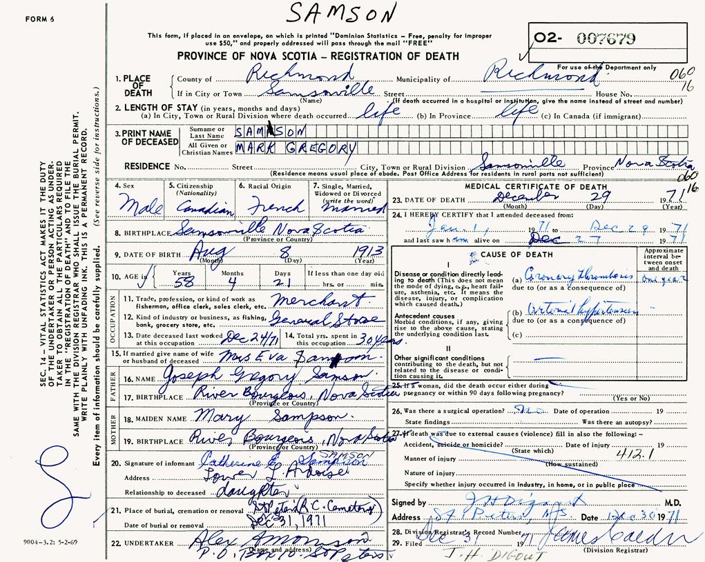 PROVINCE OF NOVA SCOTIA — REGISTRATION OF DEATH