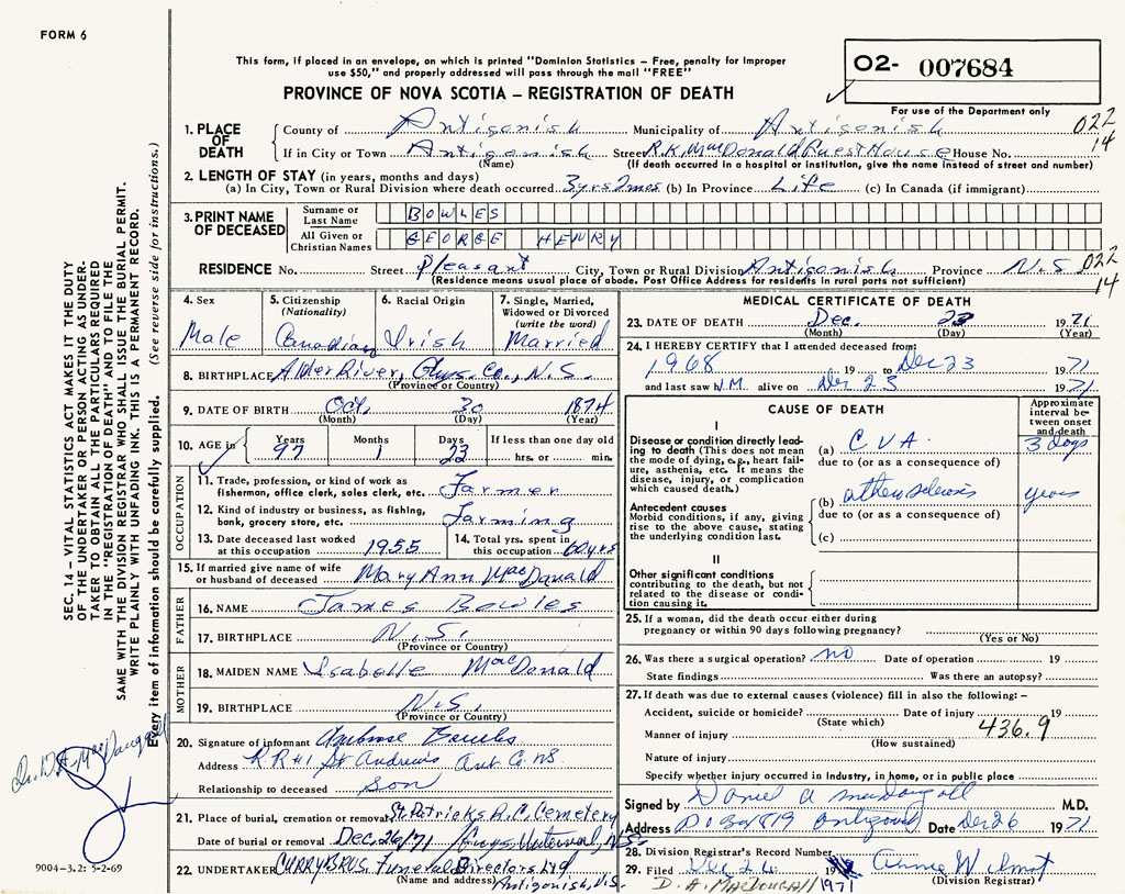 1. PLACE OF DEATH County of Antigonish If in City or Town Antigonish