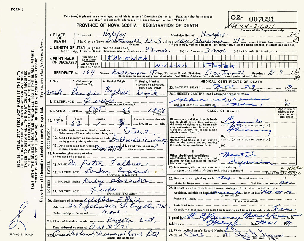 PROVINCE OF NOVA SCOTIA — REGISTRATION OF DEATH