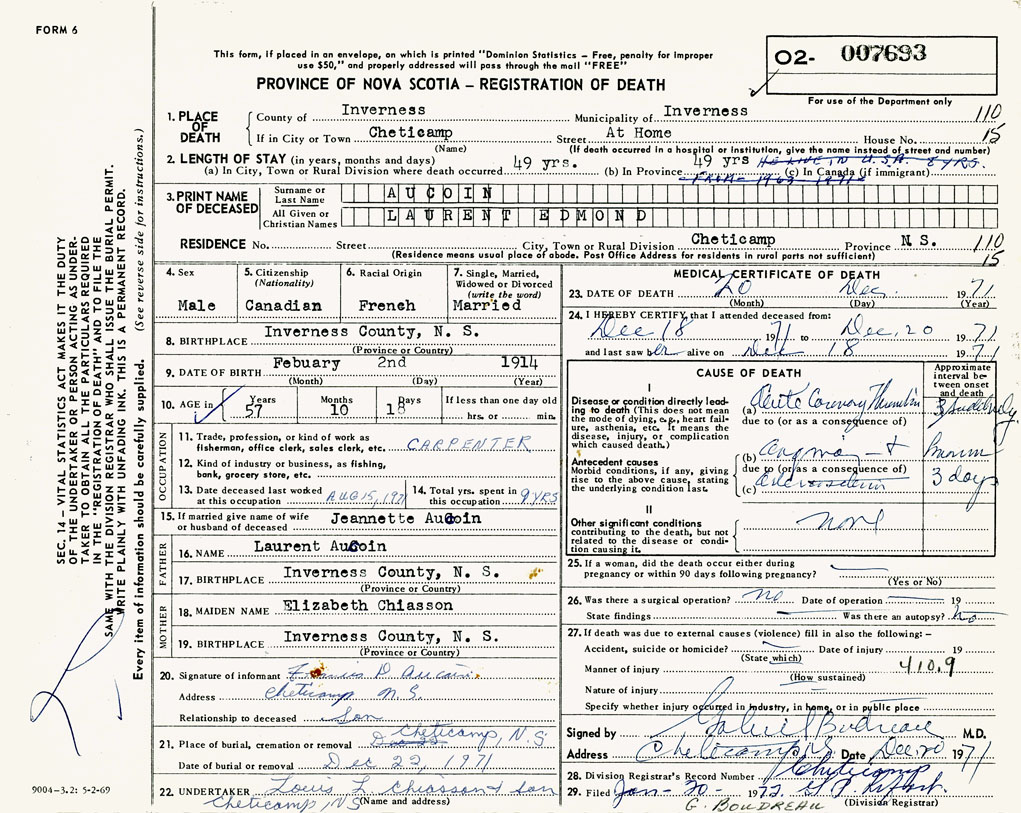 1. PLACE OF DEATH County of Inverness If in City or Town Cheticamp