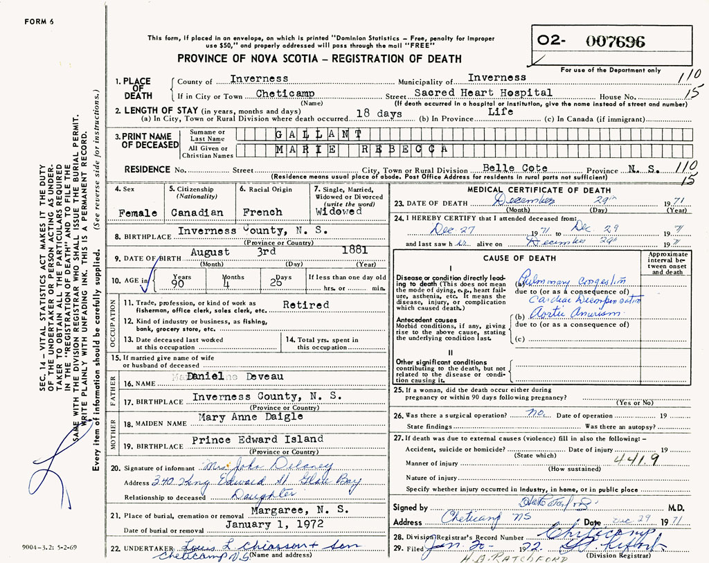 1. PLACE OF DEATH County of Inverness If in City or Town Cheticamp