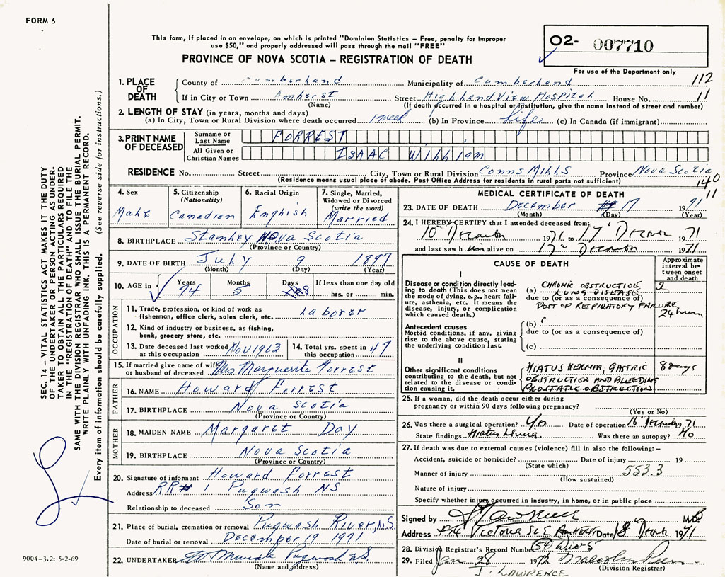 PROVINCE OF NOVA SCOTIA — REGISTRATION OF DEATH