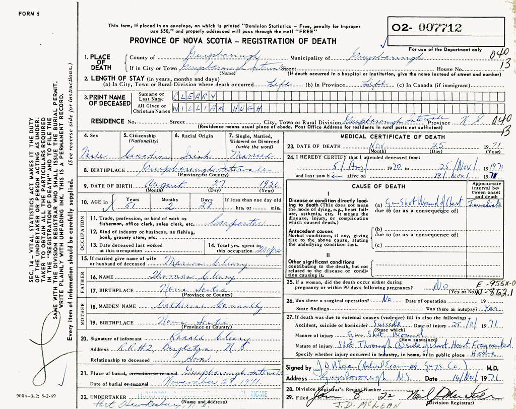 PROVINCE OF NOVA SCOTIA — REGISTRATION OF DEATH