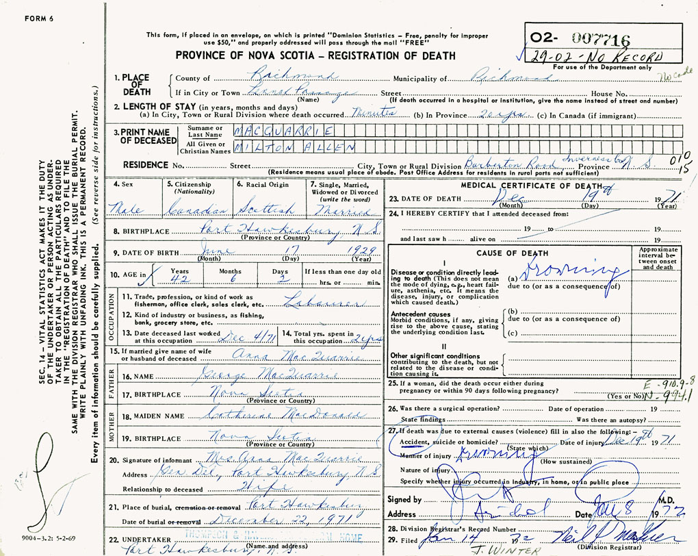 PROVINCE OF NOVA SCOTIA — REGISTRATION OF DEATH