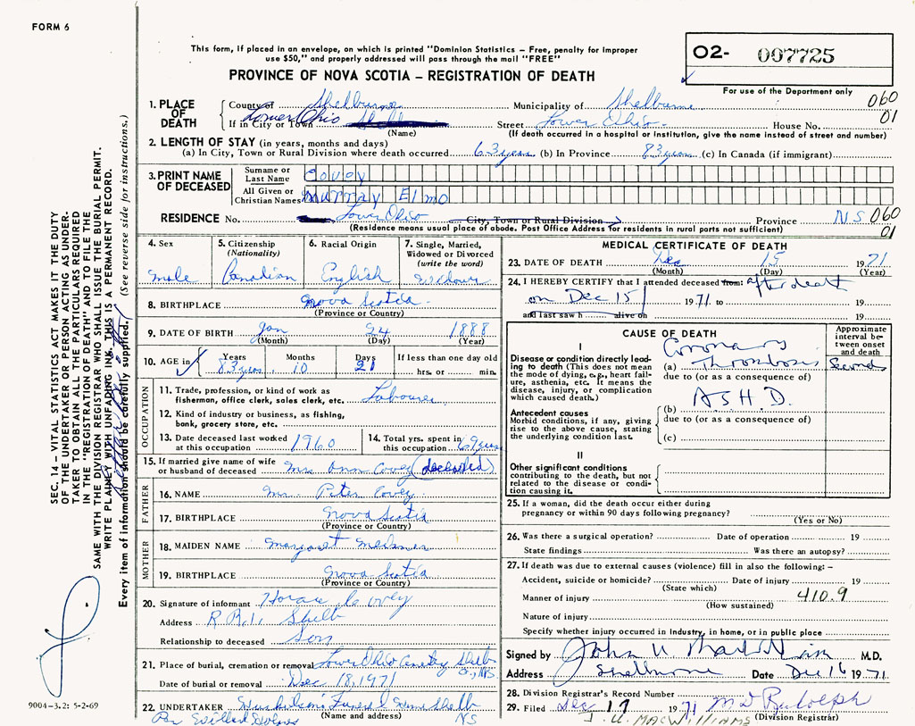 PROVINCE OF NOVA SCOTIA — REGISTRATION OF DEATH