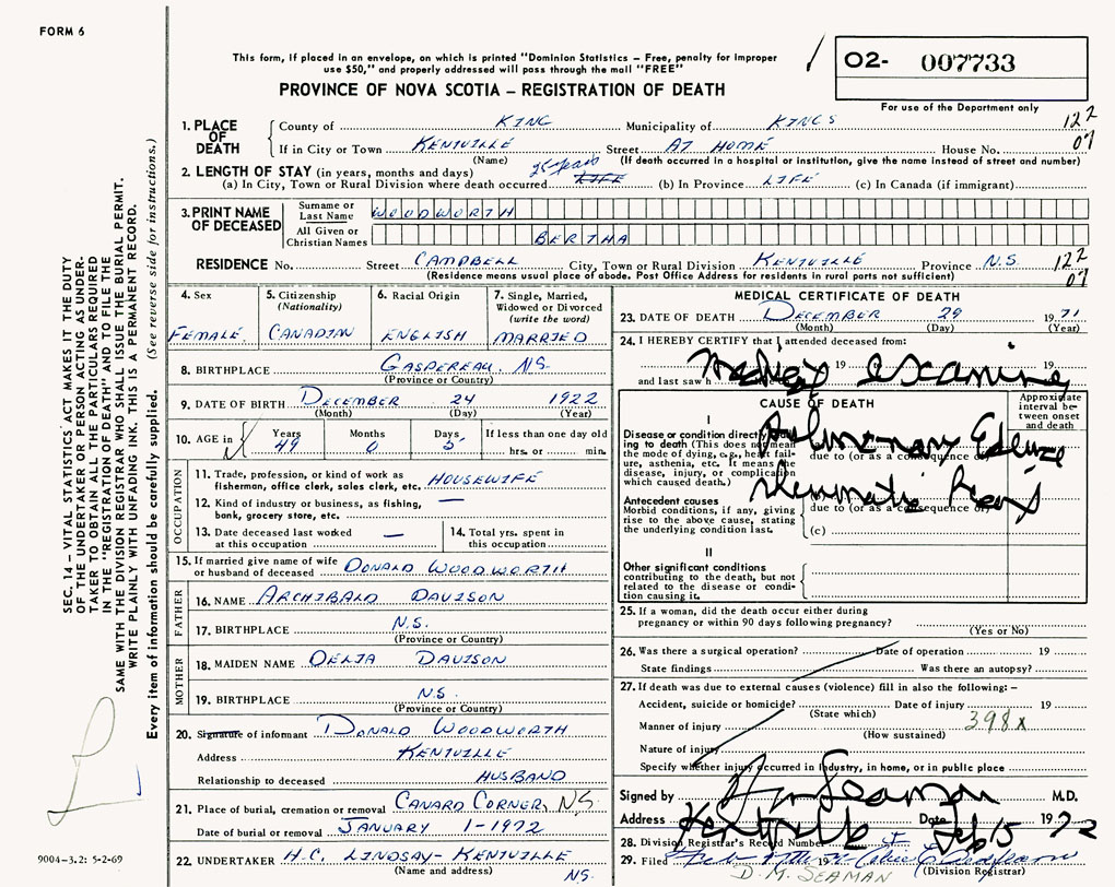 PROVINCE OF NOVA SCOTIA — REGISTRATION OF DEATH