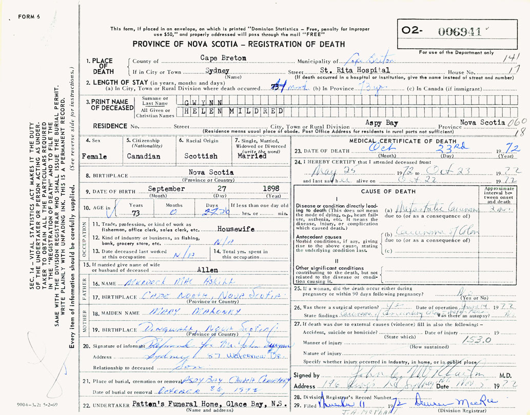 Death Registration: Year: 1972 number: 6941