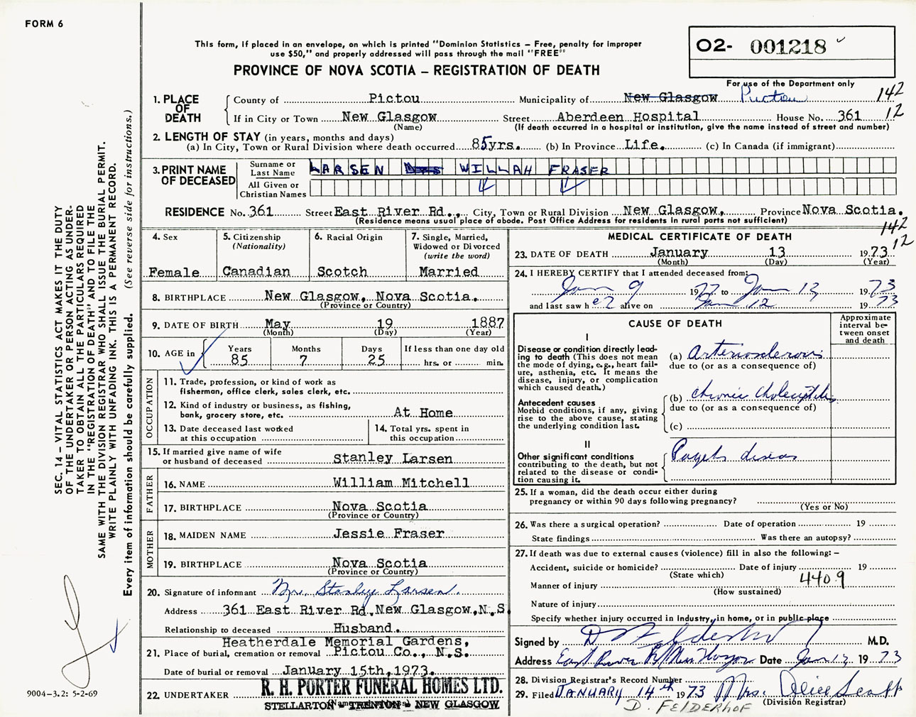 Female Death Registration: Year: 1973 number: 1218