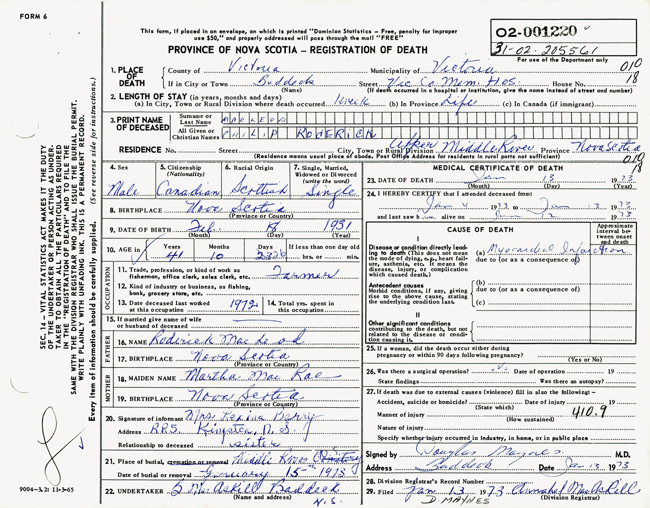 Male Death Registration: Year: 1973 number: 1220