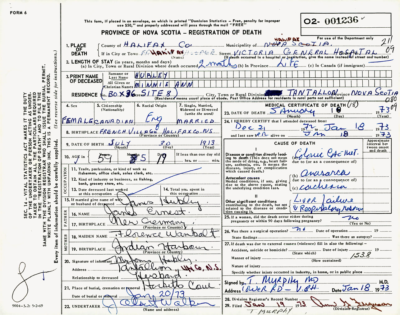 Female Death Registration: Year: 1973 number: 1236