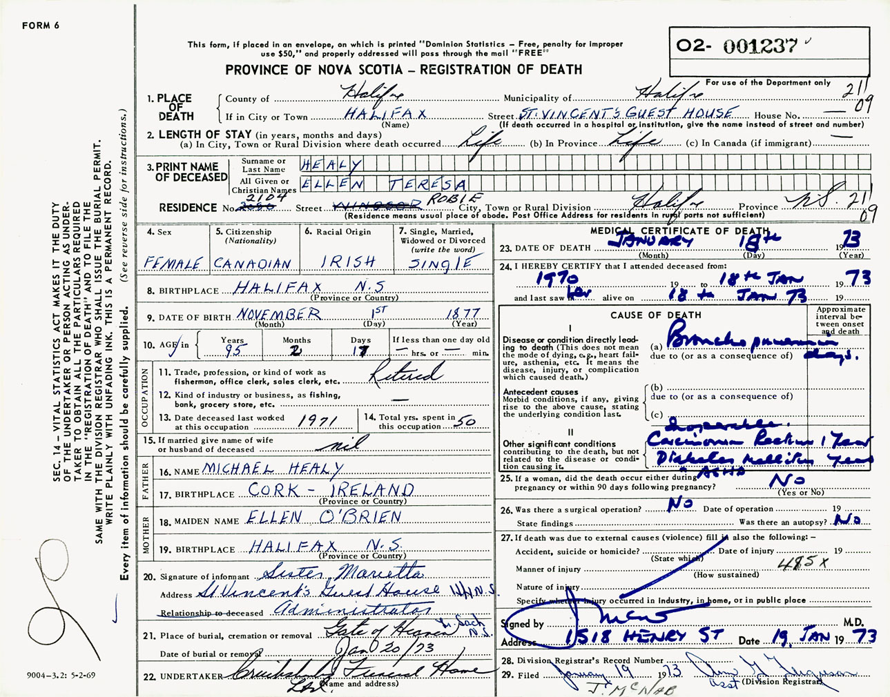 Female Death Registration: Year: 1973 number: 1237
