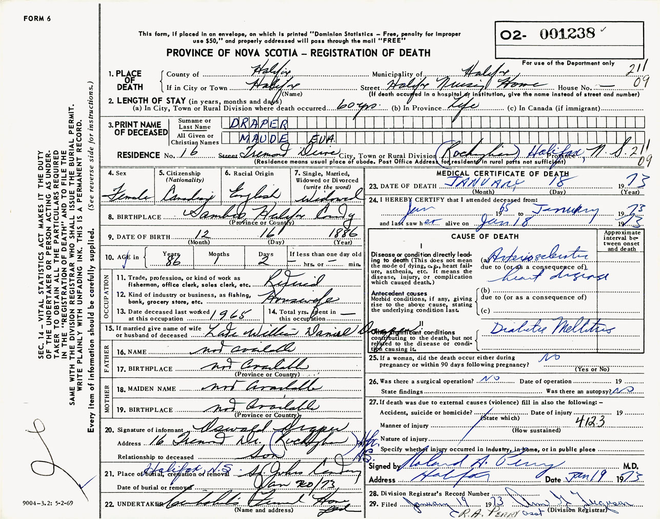 Female Death Registration: Year: 1973 number: 1238