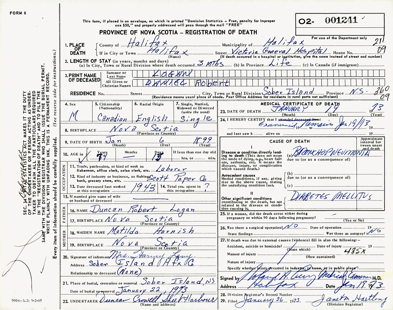 Male Death Registration: Year: 1973 number: 1241